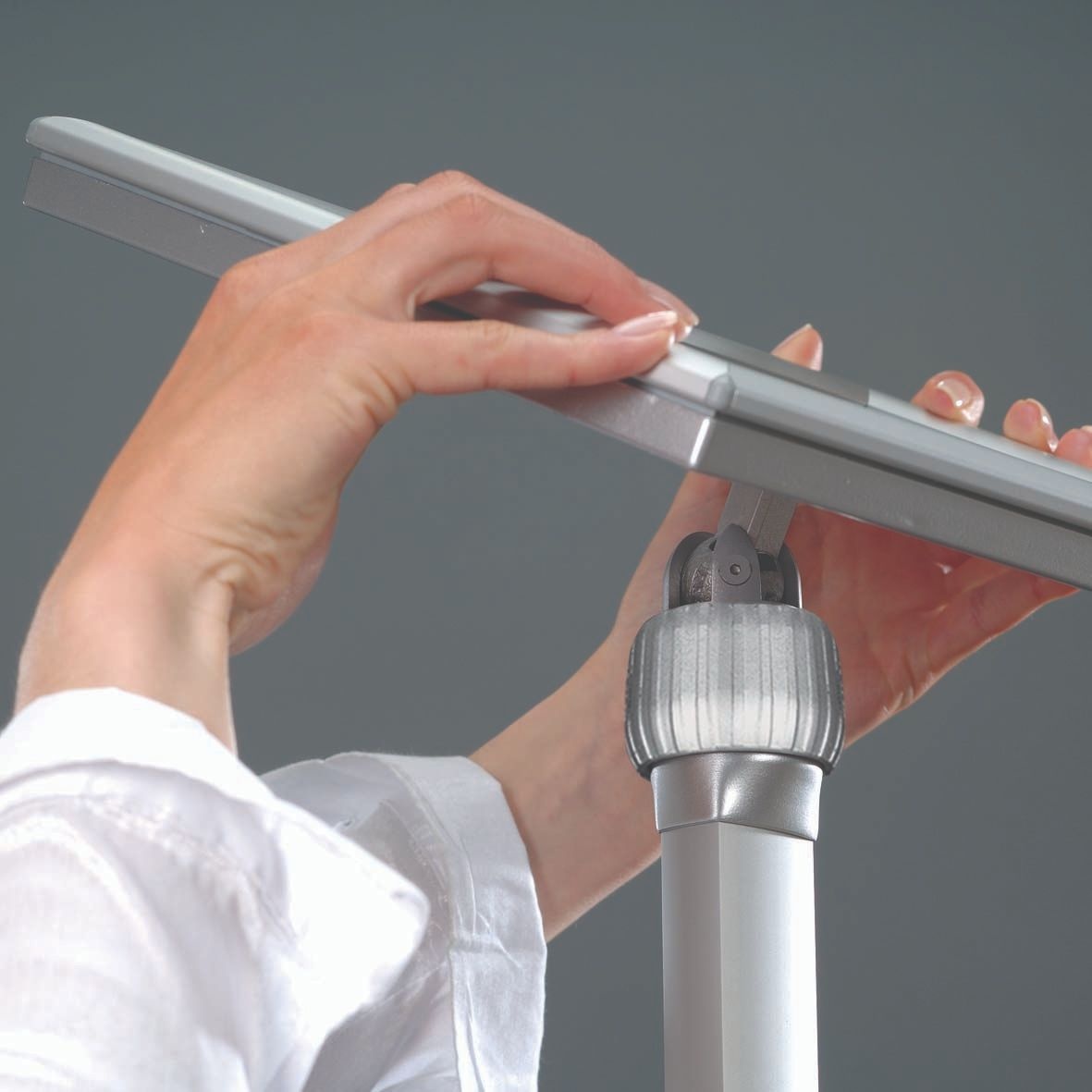 - This is a height adjustable display stand with a rotating snap poster frame.
