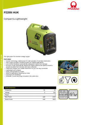 - Pramac P Series P2200i 230V Portable Inverter Petrol Generator is easy to carry, fuel-efficient, and has low noise levels.