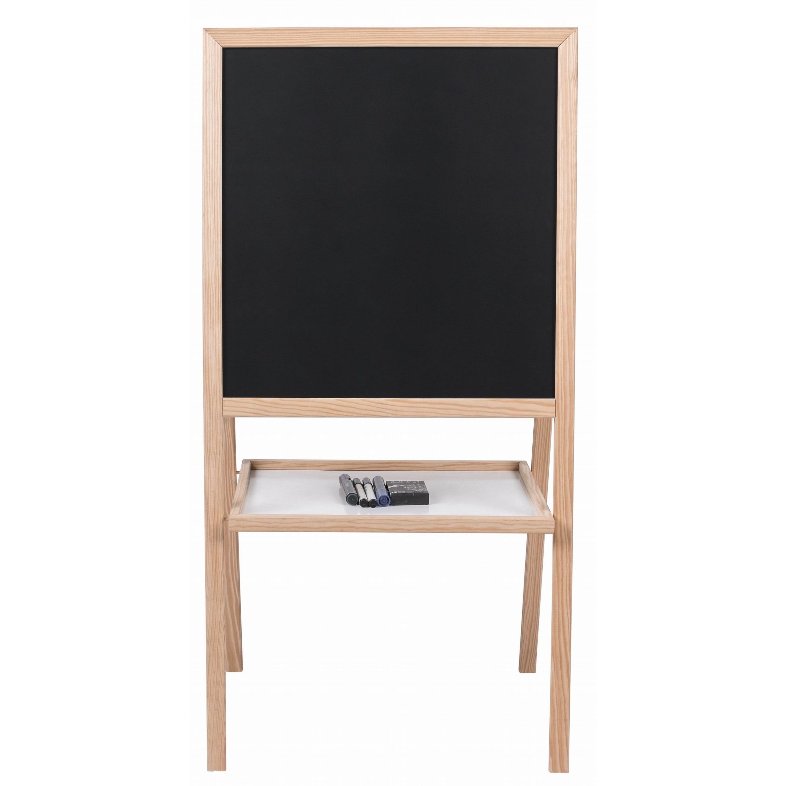 - This double-sided design includes a dry-wipe whiteboard on one side and a chalkboard on the other.