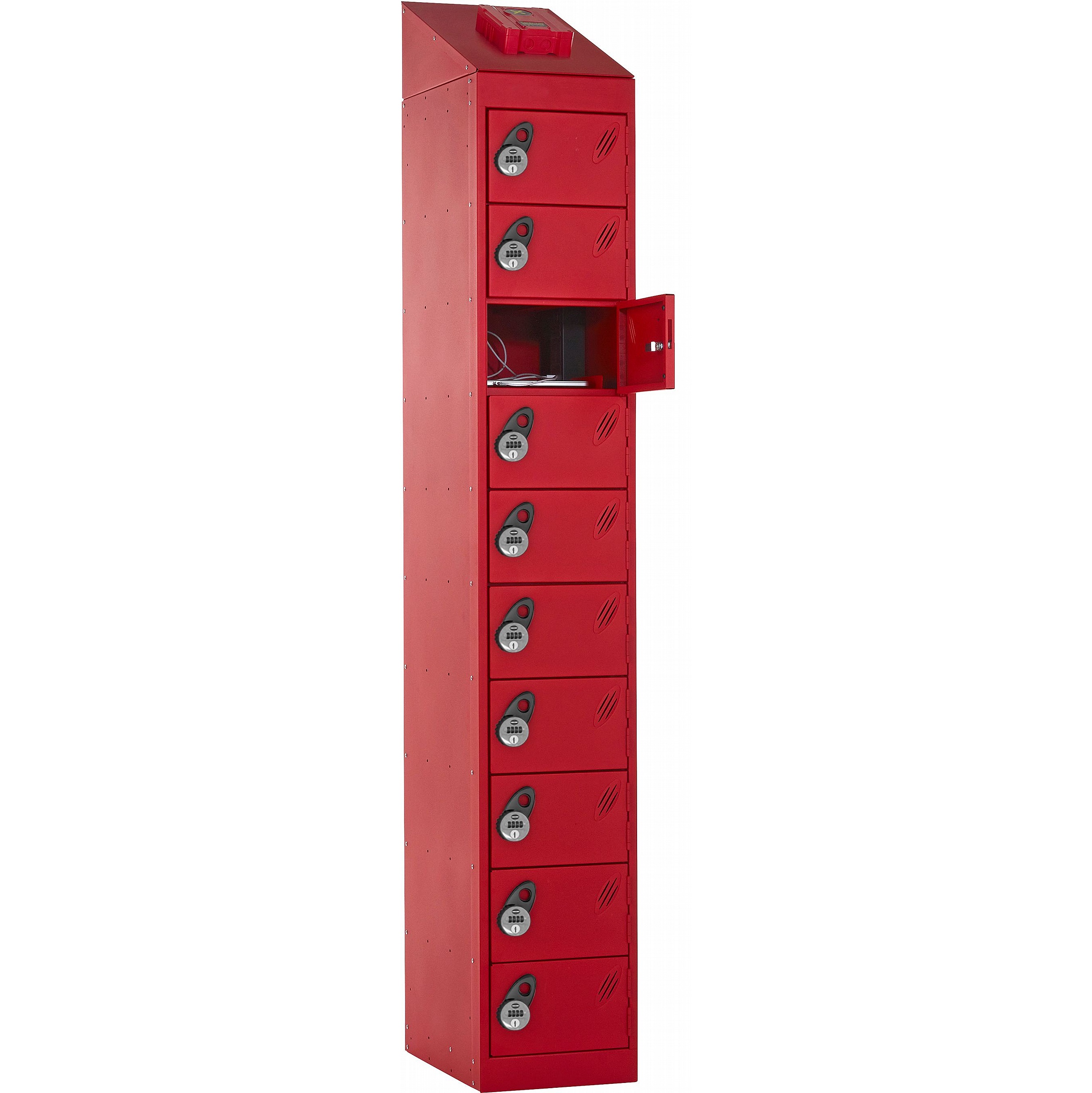 Keep your battery powered devices charged, secure and protected with the Stellar AF-X fire suppression charging lockers. These aren't your average lockers. Built by Probe here in the UK, each compartment features a built-in power spine so you can charge laptops, radios, scanners, power tools and more while they're safely locked away. But here's the really clever bit. Every compartment is fitted with the AF-X fire suppression system, a waterless aerosol technology that detects and contains lithium-ion battery fires before they have a chance to spread. It's the first system of its kind in the UK, and the aerosol is completely harmless to people, animals and the environment. This ten compartment model comes with a mechanical 4-digit combination lock on each door for quick, secure access. And for added peace of mind, these lockers come with a 7 year manufacturer's guarantee, so you know they're built to last.Details