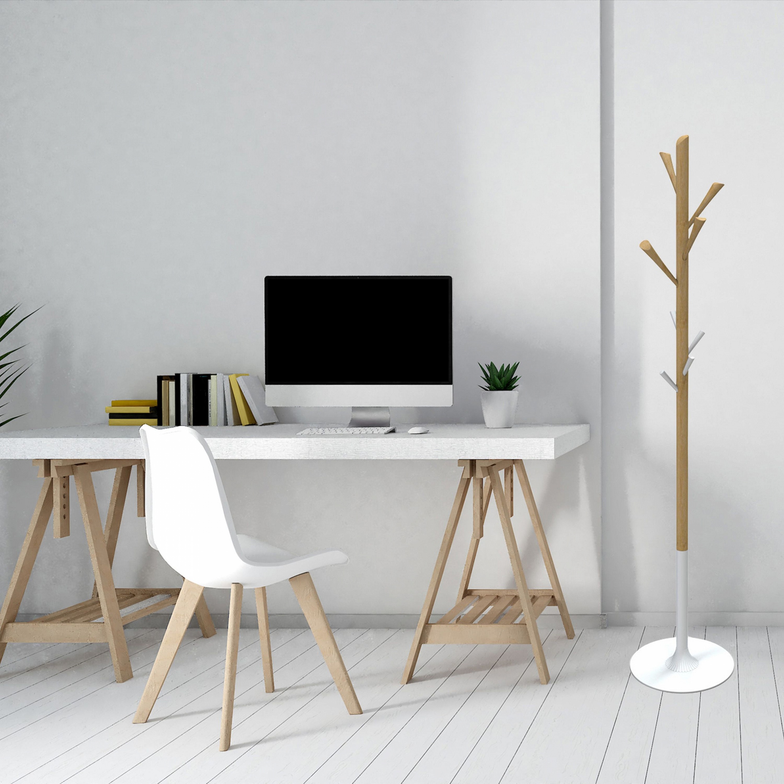 - This freestanding coat stand includes multiple hanging points arranged in a tree like design.