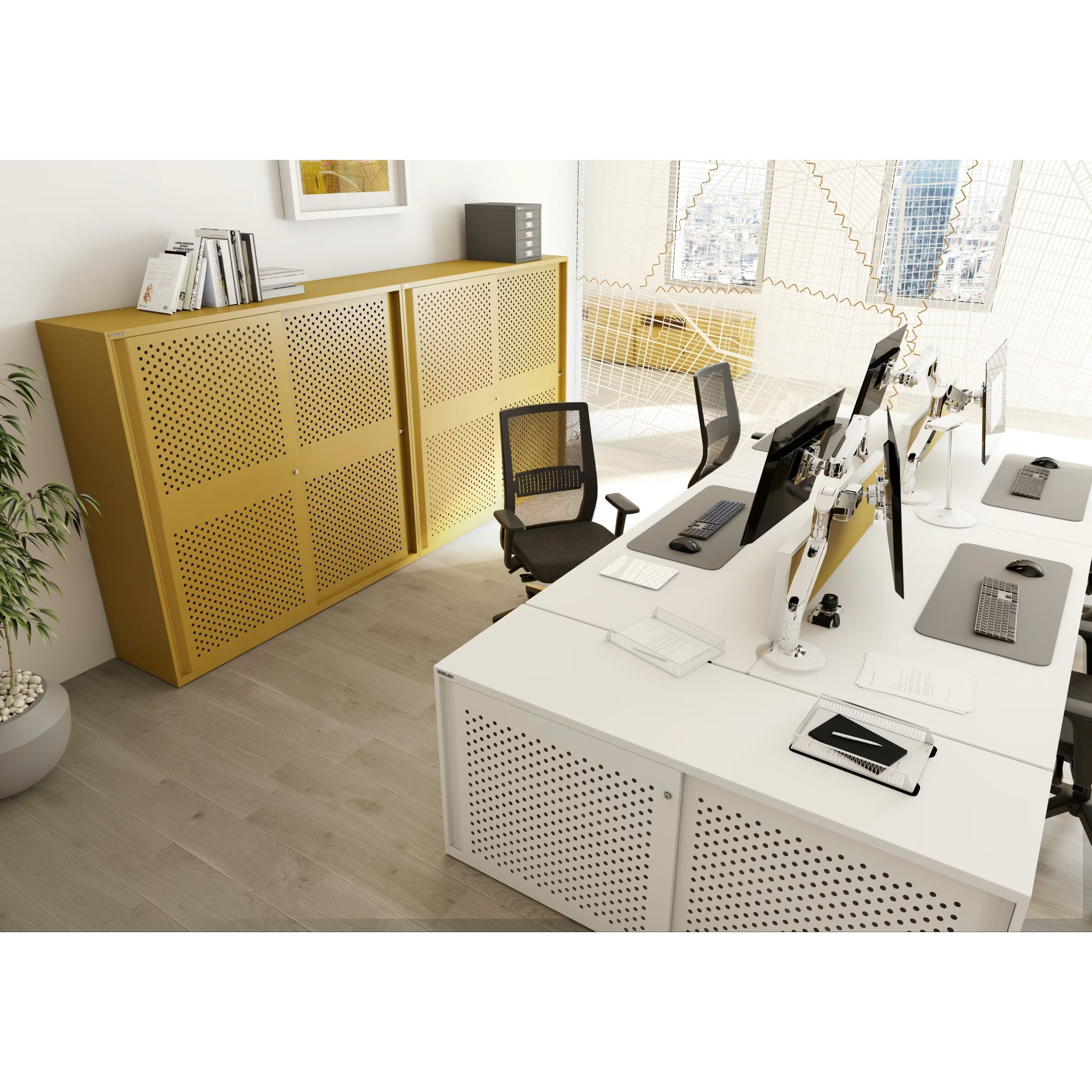 Enhance your working environment with UK made office furniture and storage from Bisley. Discover a comprehensive range of high-quality office furniture, tailored to meet your needs. These Bisley Glide Sliding Perfo Door Metal Office Cupboards offer a simple, space saving way to bring practical storage into busy workplaces or home offices. The perforations introduce a modern, lighter look that works beautifully in contemporary interiors, while the smooth running doors make them just as practical in tighter spaces. They’re built to the same high Bisley standard, giving you a dependable storage partner for everyday use. Offered with an impressive 10 year guarantee to ensure peace of mind.Details