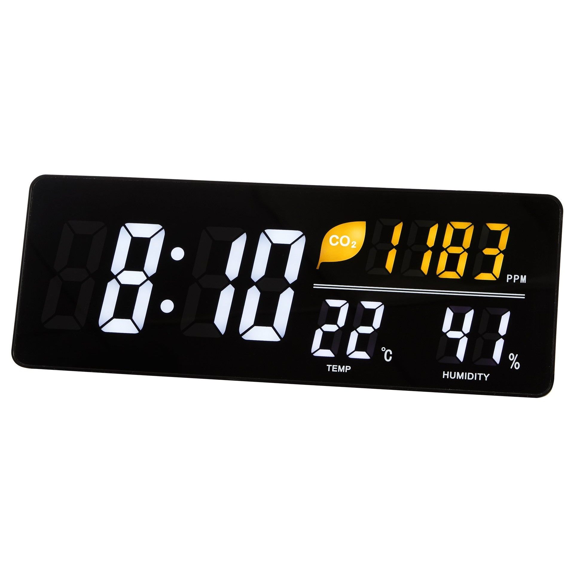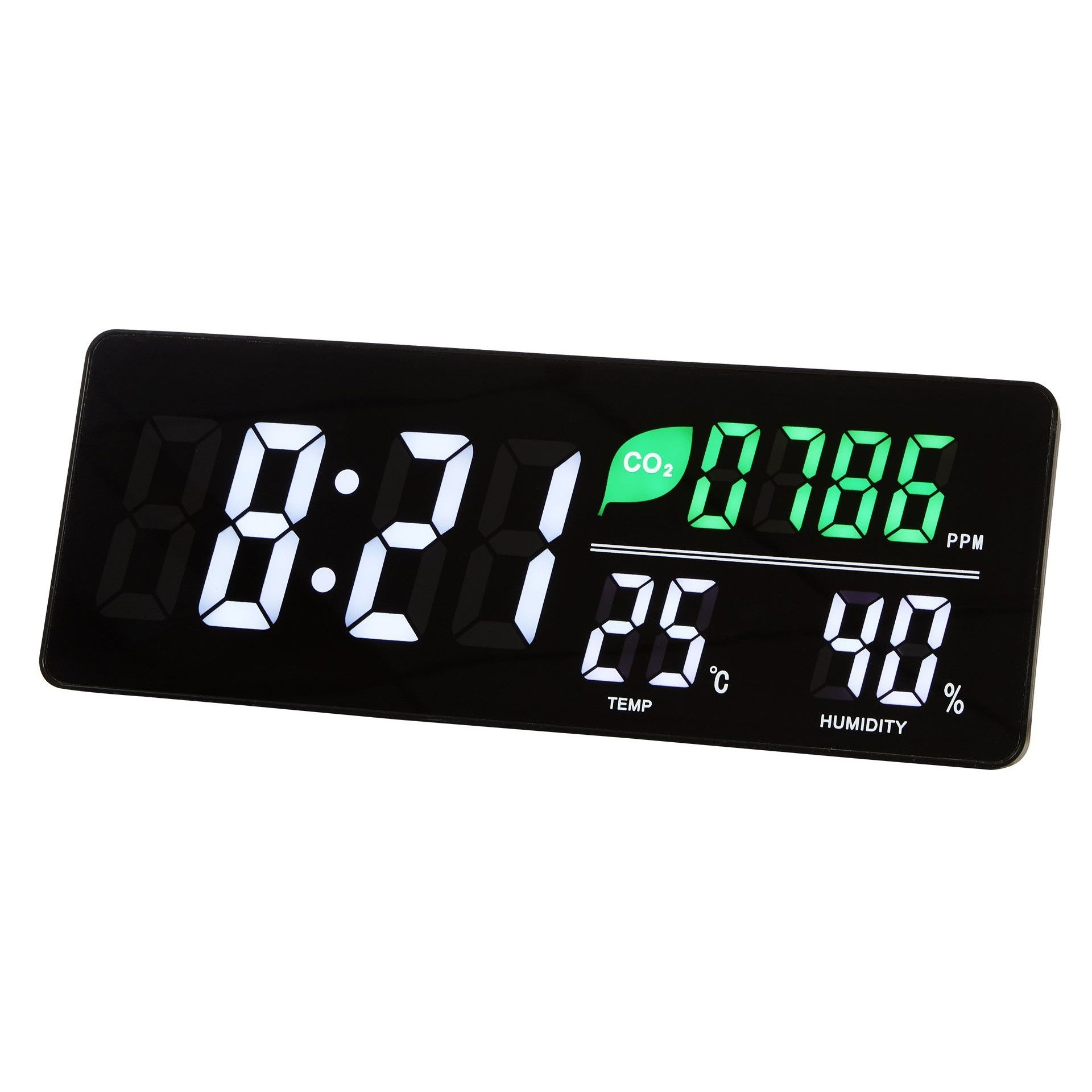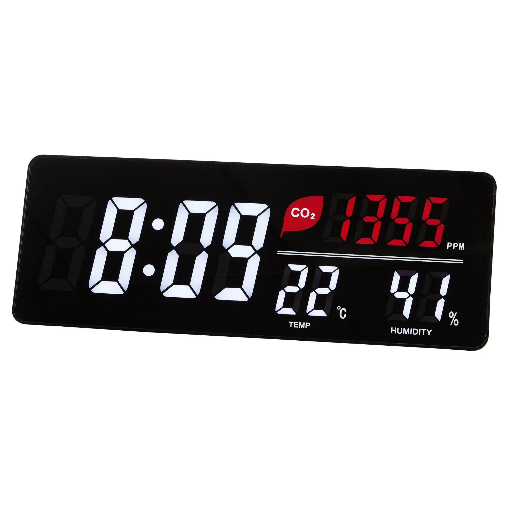 - Large LED display shows time, CO2 levels, temperature, and humidity—so you can monitor indoor conditions at a glance.