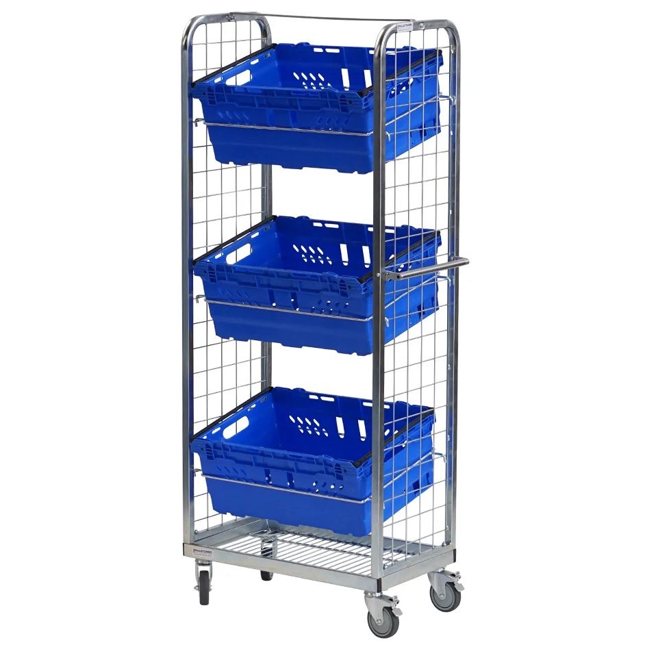 - Complete with 3 ‘C’ shaped shelves to hold 375x55mm crates and prevent items falling off.