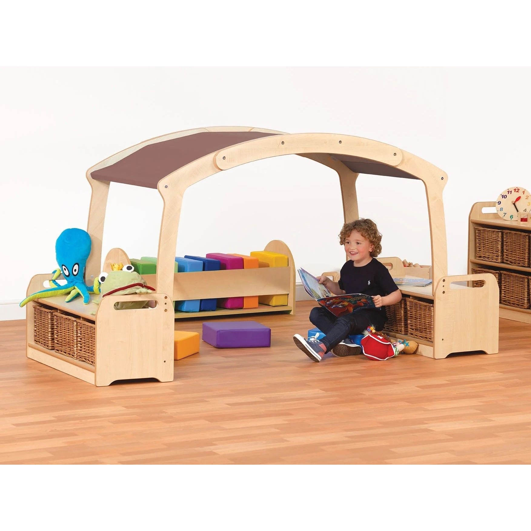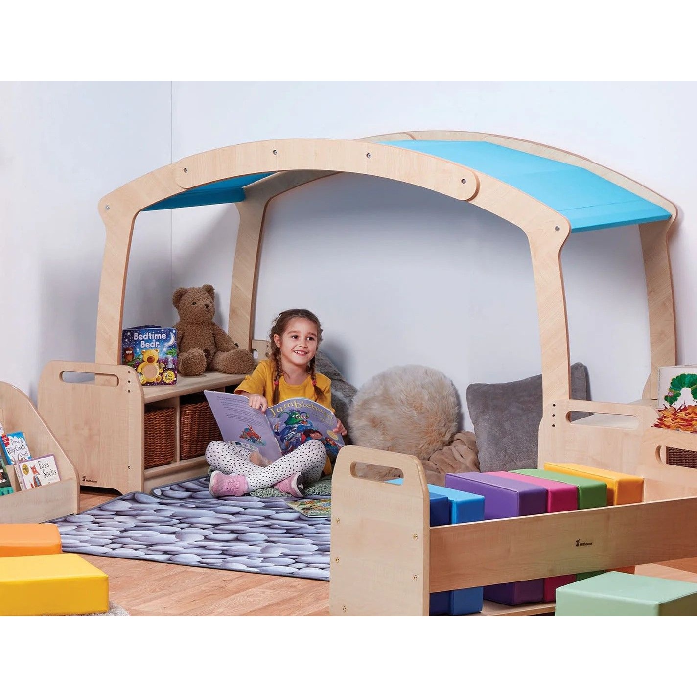 The Cosy Reading Zone Low Den Cave Bundle creates a calm, welcoming place where children can settle into reading and quiet play. Its gently sheltered shape offers a cosy sense of retreat without blocking visibility, helping little ones feel secure while still connected to the room around them. Paired with soft seating and practical storage, it supports independent book-choosing and peaceful moments throughout the day. This bundle brings everything together to form a dedicated reading corner that feels special, comfortable, and easy to maintain.Details