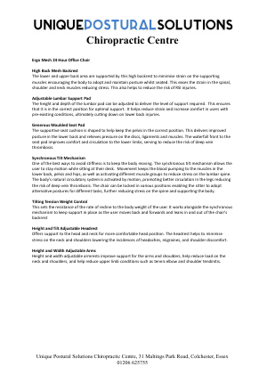 Make sure you sit well with our Ergo Mesh 24 hour office chair. This fantastic ergonomic chair will keep you comfortable all day, even when you're putting in overtime. Ergo Mesh 24 is well built for optimum comfort. The breathable mesh backrest is flexible, providing constant support where you need it most keeping you cool and comfortable all day long. And to top it all off, it is UK Chiropractor approved! All you have to do is sit!Details