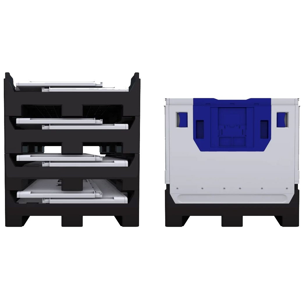 - Boxes can be stacked up to four units high in use or nine units high when collapsed