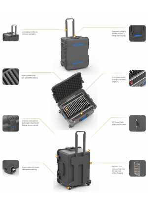 The LapCabby GO 16 tablet charging and storage case is the ultimate portable charging solution for your tablet devices, making it ideal for those on the go. This versatile case can charge up to 16 tablets, up to 13”, all within one compact, travel-friendly unit. Featuring integrated extendable wheels and handles, it offers effortless mobility, making it ideal for educators, contractors, photographers, and more. Crafted from durable materials, the case is built to withstand frequent use while providing reliable protection for your devices. For added security, it includes four locking clasps and two stainless steel padlock protector holes. Delivered fully assembled and ready to use straight out of the box, the LapCabby GO 16 is the perfect combination of practicality and performance. Plus, for added peace of mind, it comes with a 5-year Warranty for all parts, including electrical, ensuring lasting reliability and performance.Details