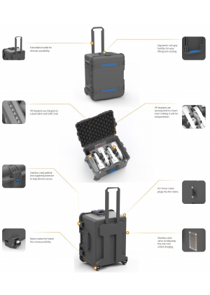 The LapCabby GO VR headset charging and storage case is the ultimate portable charging solution for your VR headsets, making it ideal for those on the go. This versatile case can charge up to 4 headsets, all within one compact, travel-friendly unit. Featuring integrated extendable wheels and handles, it offers effortless mobility, making it ideal to transport. Crafted from durable materials, the case is built to withstand frequent use while providing reliable protection for your devices. For added security, it includes four locking clasps and two stainless steel padlock protector holes. Delivered fully assembled and ready to use straight out of the box, the LapCabby GO VR headset is the perfect combination of practicality and performance. Plus, for added peace of mind, it comes with a 5-year Warranty for all parts, including electrical, ensuring lasting reliability and performance.Details