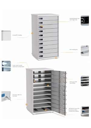- This compact laptop storage and charging unit has 10 lockable compartments that fits laptops up to 15.6”.