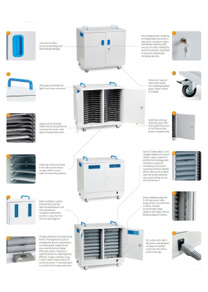 - It horizontally stores 32 Tablets, Laptops or Chromebooks up to 14” including the case.