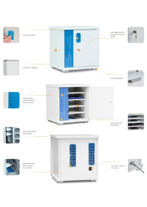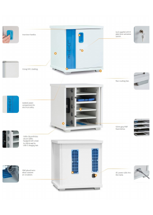 Looking for a sleek and reliable solution to keep your devices charged and organised? The LapCabby lyte 5H tablet charging and storage cabinet is the perfect choice. This compact unit efficiently charges up to 5 devices simultaneously, up to 11”. The Lyte 5 ensures quick and efficient charging for all connected devices. With its silent charging capability and a unique ventilation system, you won’t have to worry about noisy fans disrupting your environment. Designed for maximum security, the cabinet includes a lock with a 6-plate lever activation system and a separate lockable power compartment for added safety. Built with high quality materials and durable construction, it’s ideal for busy environments such as education, healthcare, retail, and commercial settings. Delivered fully assembled, it’s ready to use straight out of the box with no setup required! For added peace of mind, it comes with a Lifetime Warranty and a 5-year Electrical Guarantee, ensuring lasting reliability.Details
