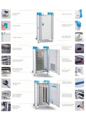 - Store devices securely and charge them up ready for the next day with the LapCabby uni 20H horizontal laptop charging and storage trolley.