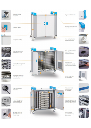 - Store devices securely and charge them up ready for the next day with LapCabby uni 32H horizontal laptop charge and storage trolleys.