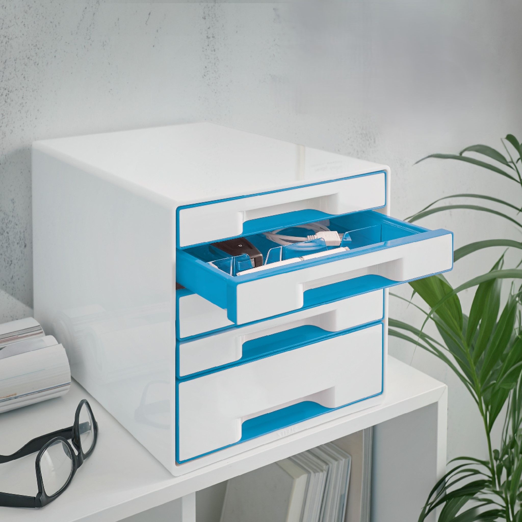 Add a pop of colour and up your organisational game with the Leitz Colour 5 Drawer Desktop Cabinet. Whether it's being used in an office, educational institution, creative area or your home the 5 drawer desktop bassinet is perfect for getting things off your desk and out of sight. And thanks to its compact light weight design the Leitz Colour 5 Drawer Desktop Cabinet is perfect for any desktop or counter allowing you to keep your things at hand and easily accessible.Details