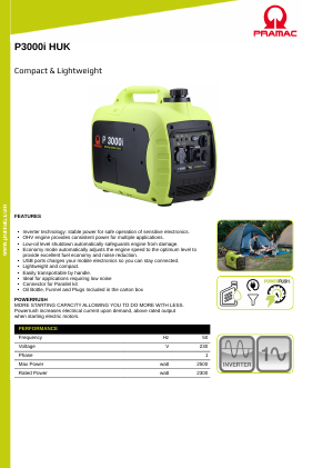 - Pramac P Series P3000i 230V Portable Inverter Petrol Generator is easy to carry, fuel-efficient, and has low noise levels.
