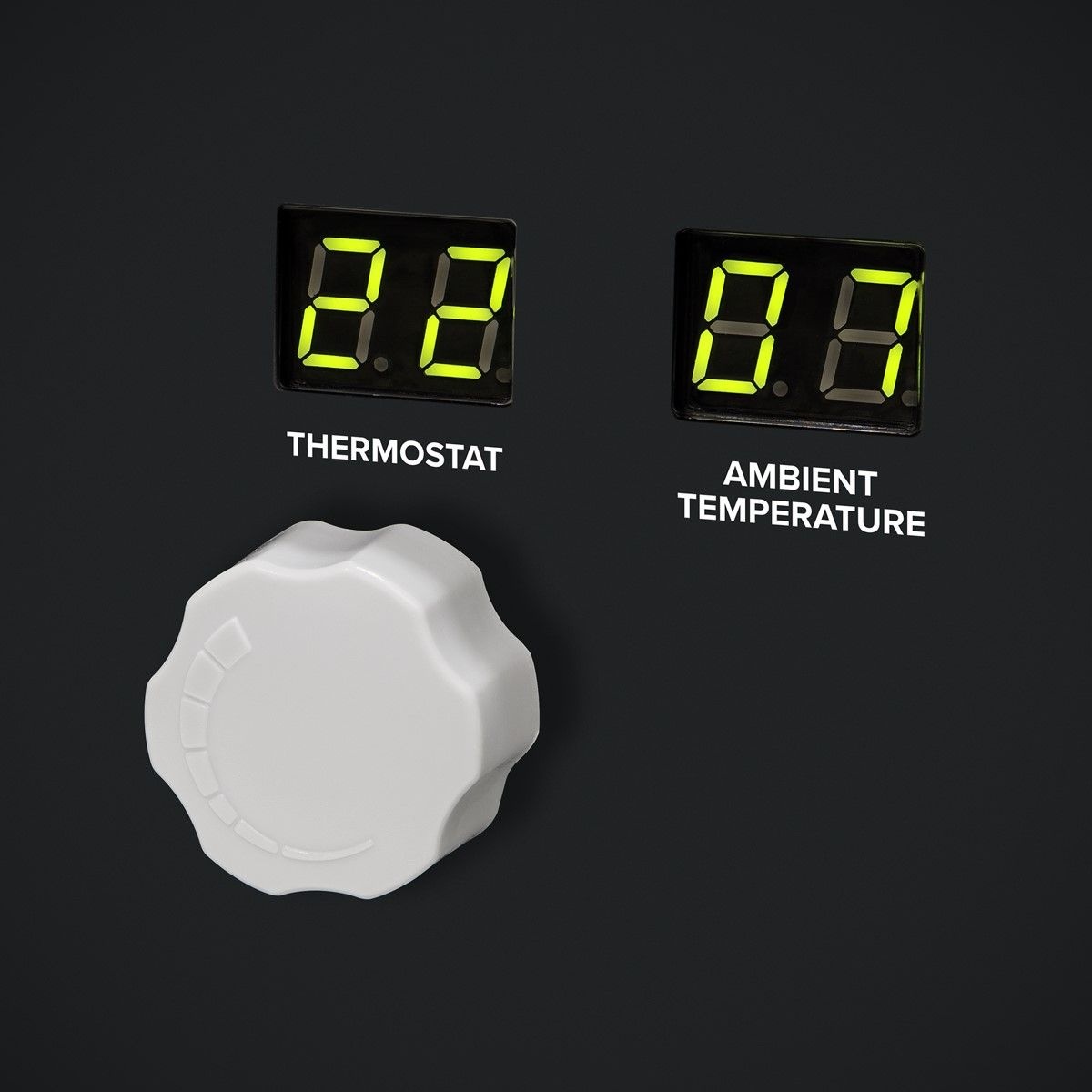 - Includes a dual LED display showing both ambient temperature and your thermostatically controlled set temperature.