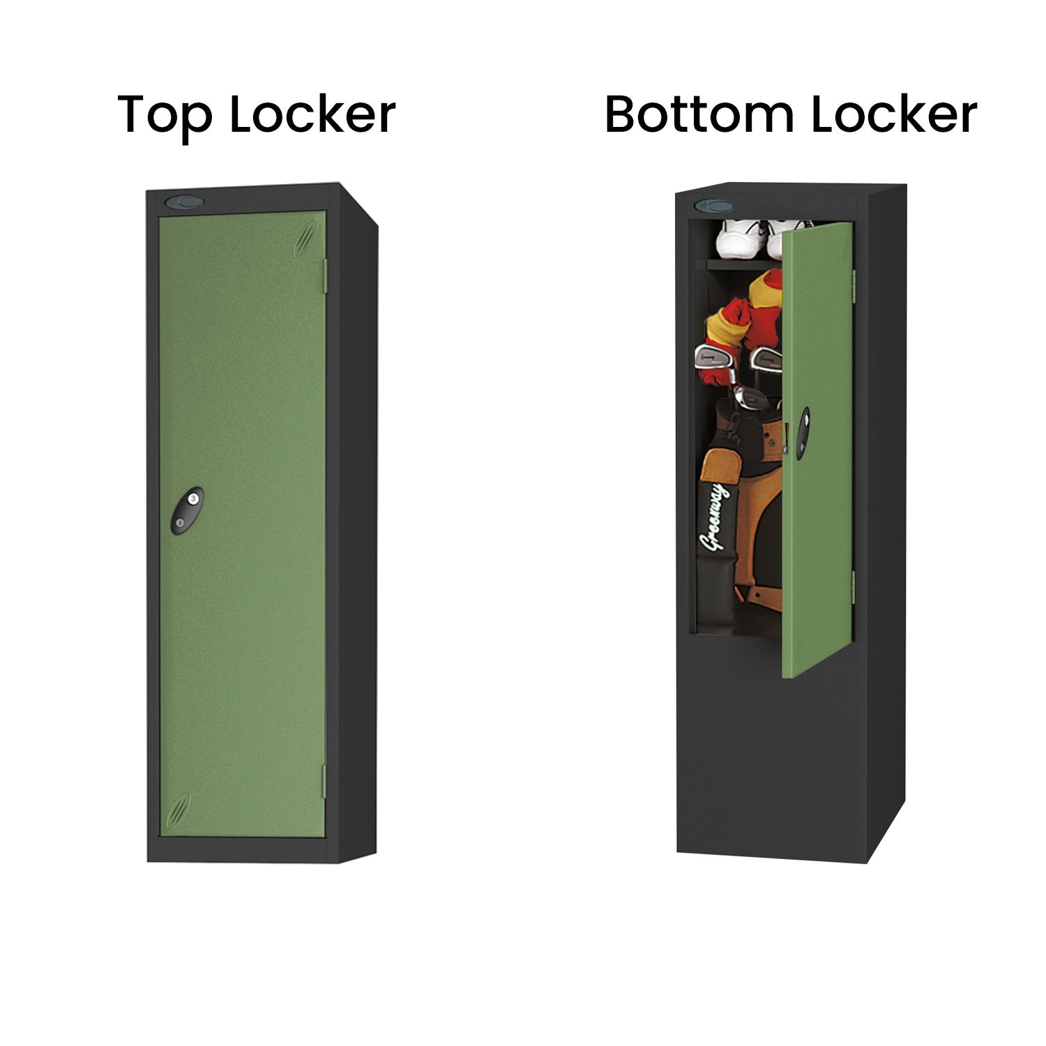 - Top locker can be used standalone on ground, or can be positioned on top of a bottom locker to create a 2 tier system.