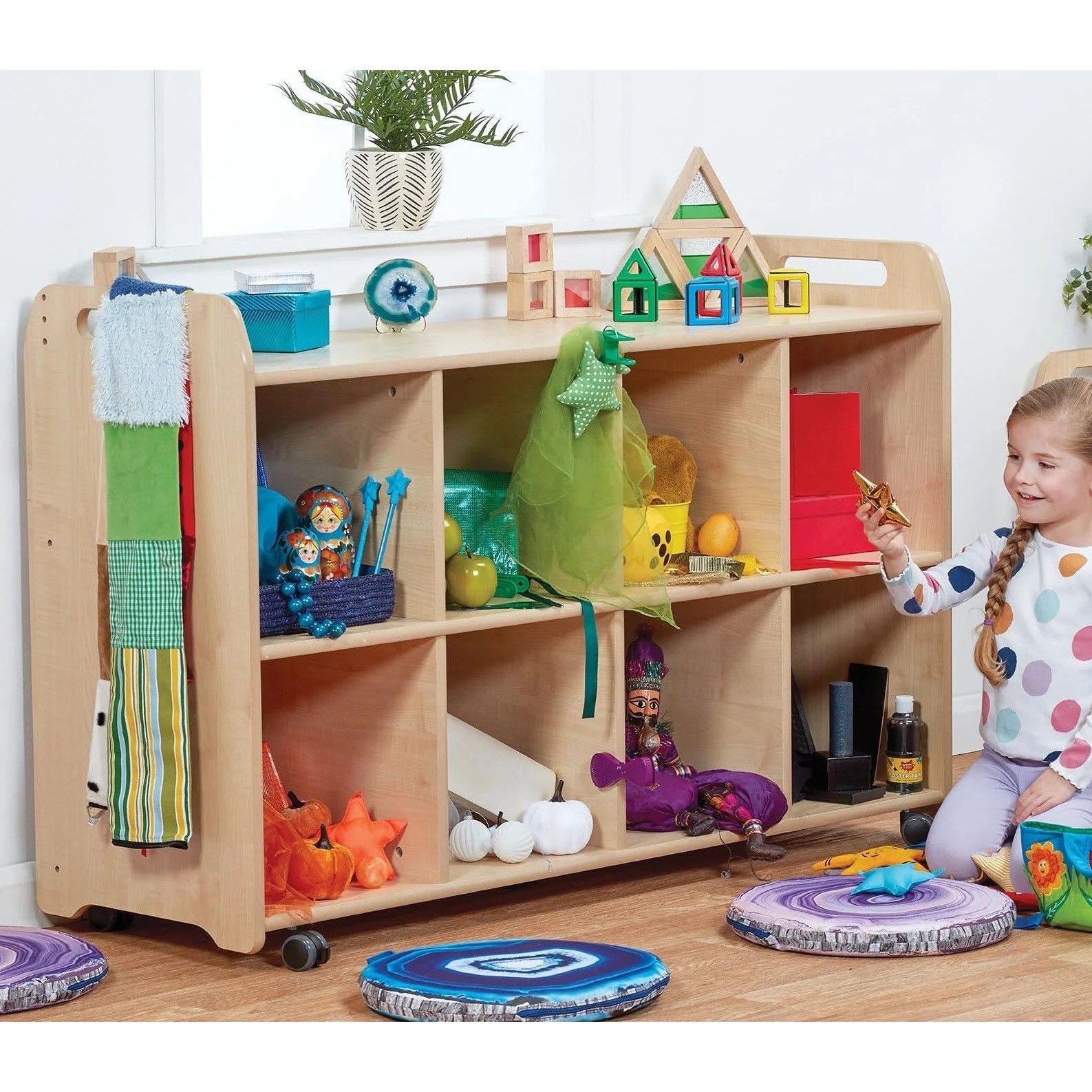 - Includes 8 even square cubbies, providing generous space for books, baskets and learning materials.