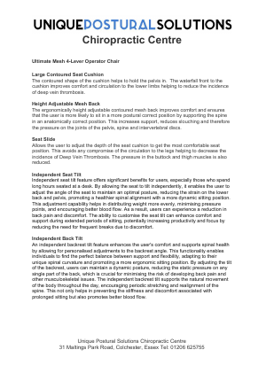 The Ultimate family of ergonomic chairs keeps sitters in style and comfort with ease. The Ultimate mesh operator chair is a great little performer, packed with adjustable features to make sure you sit well every day. This mesh back ergonomic office chair offers a personalised fit with adjustable backrest, seat and armrests. This chair works it, whether you are the only sitter, or several people are sharing the chair in a multi-user environment. It really has everything you need to achieve ‘Ultimate’ in comfort! And the icing on the cake is that it is UK Chiropractor approved!Details