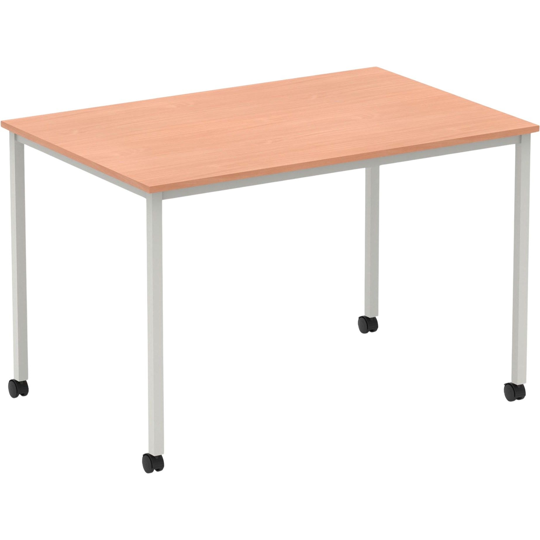 - 18mm thick rectangular tabletop in wipe clean melamine features impact resistant edging.