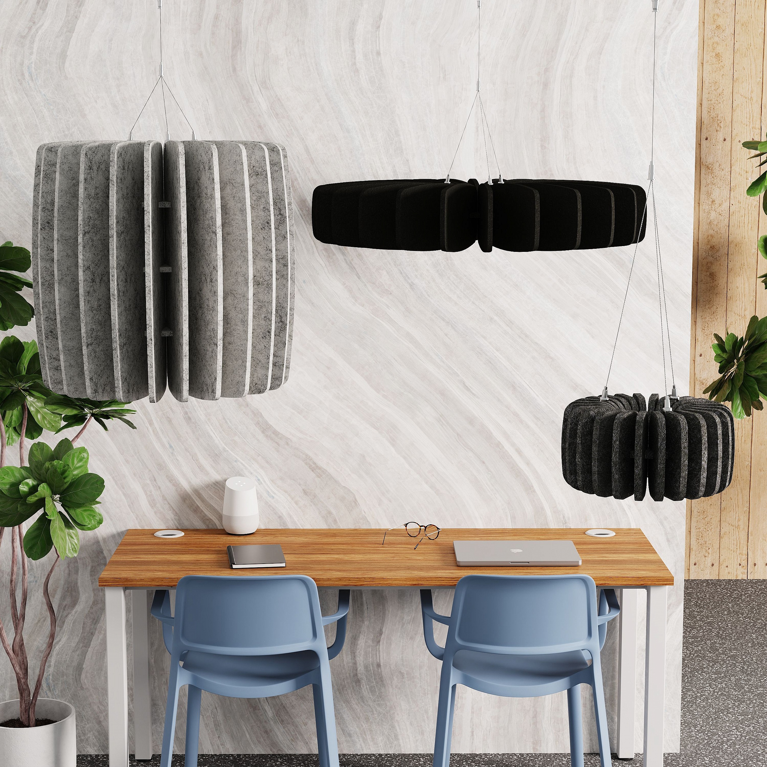 Create a quieter, more comfortable workspace with Sch! Ceiling Baffles, designed to reduce noise and soften echo in busy environments. These overhead acoustic panels help transform overwhelming spaces into calmer, more focused settings where conversations are clearer and the atmosphere feels more relaxed without any extra effort on your part. Made from PET felt using 100% recycled materials, Sch! baffles are available in a range of colours to suit any interior, and when suspended above the workspace, they naturally settle the room and let the rest flow.Details